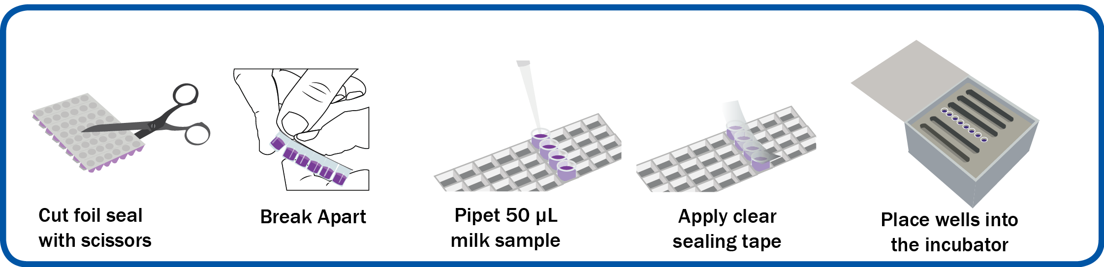 Antibiotics are the most common inhibitors found in raw milk. The test consists of a single service well that contains pre-measured bacterial sporesA, media, and a pH indicator. Reagents are unit dosed and compartmentalized to ensure uniformity. This eliminates reagent transfer steps and prevents inadvertent contamination and reagent loss.