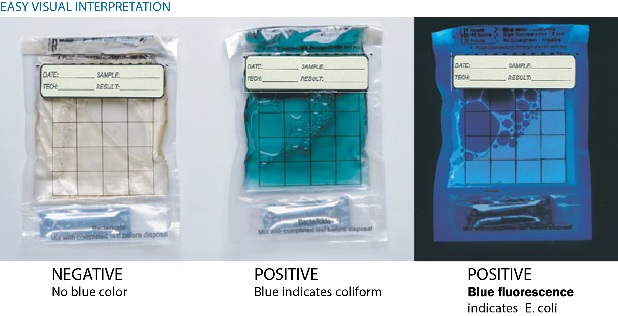 sample is confirmed for E. coli. If the blue bag does not fluoresce after 48 hours, the sample is coliform positive and E. coli negative.