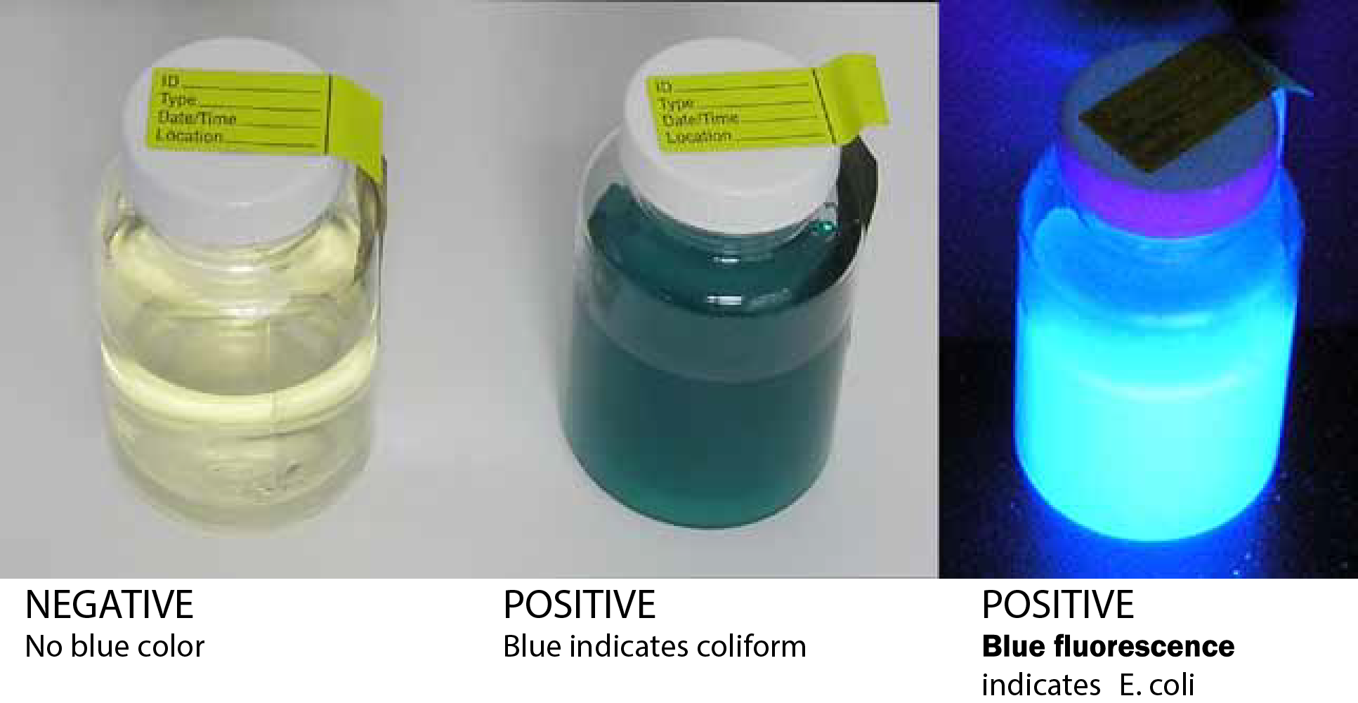 If the sample turns blue, coliforms are present. If a blue coliform positive sample fluoresces, E. coli are present. If a blue sample
